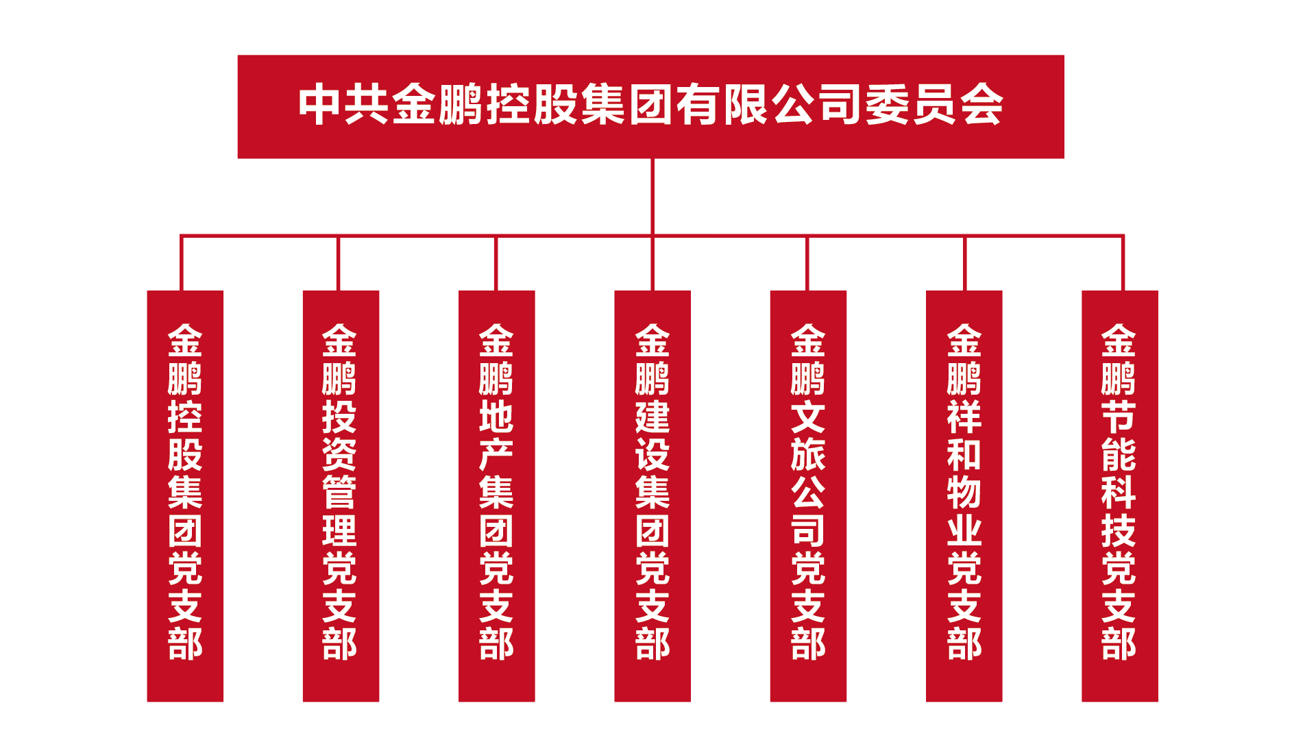 中共金鵬控股集團(tuán)有限公司委員會(huì),下設(shè)控股總部、建設(shè)集團(tuán)、地產(chǎn)集團(tuán)、文旅公司、投資管理、節(jié)能科技、祥和物業(yè)7個(gè)黨支部。