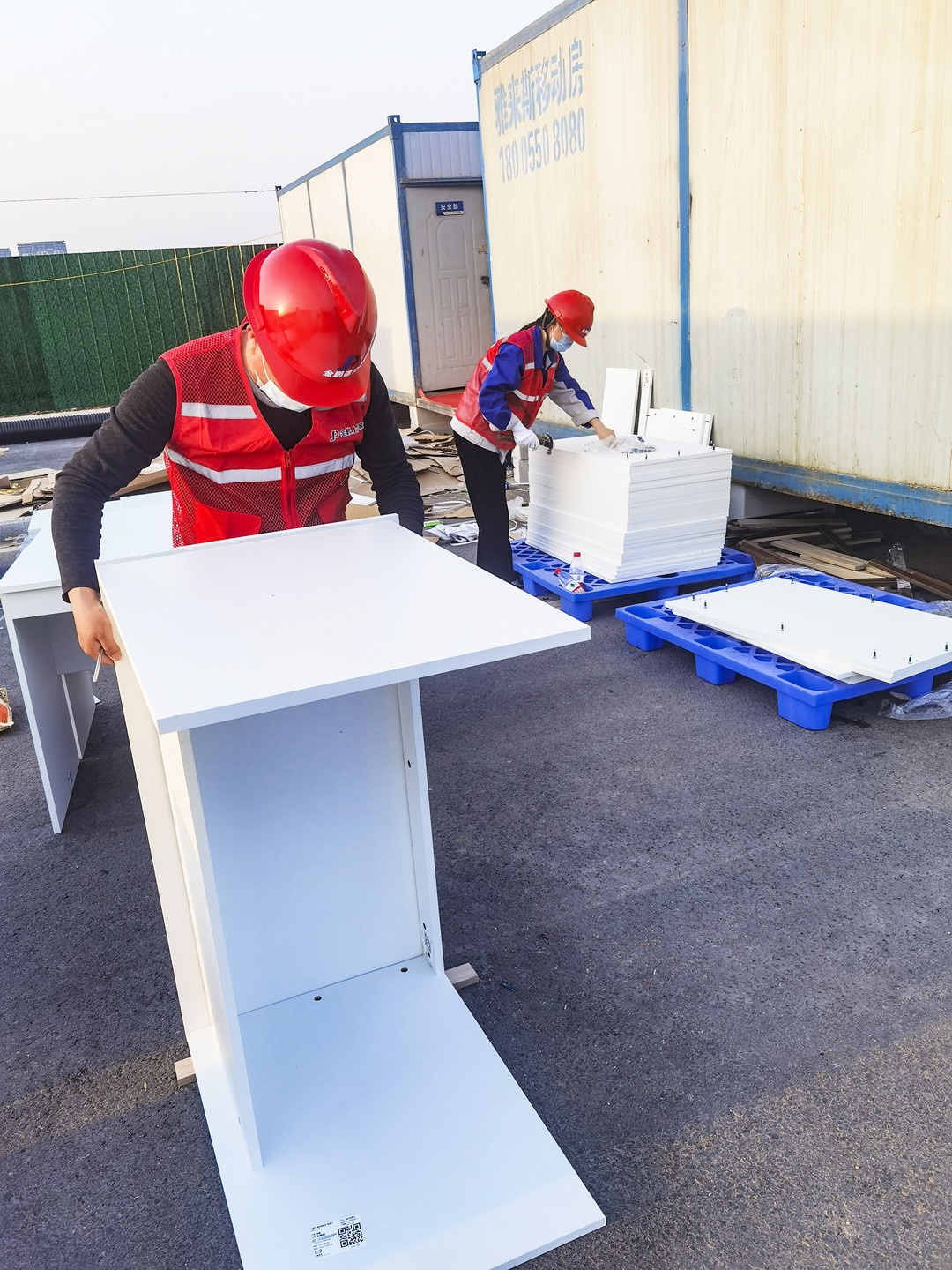 在接到任務(wù)當(dāng)天完成設(shè)計(jì)、拆單、生產(chǎn)計(jì)劃。4月3日第一批300組隔離間的配套家具生產(chǎn)完成并送到現(xiàn)場進(jìn)行安裝;4月4日500組隔離間配套家具已全部生產(chǎn)完成;4月5日剩余200組隔離間的配套家具全部送達(dá)現(xiàn)場。截至4月5日晚已完成安裝350組隔離間的配套家具。任務(wù)在持續(xù),金鵬上尚家居的“戰(zhàn)斗”一直在繼續(xù)......