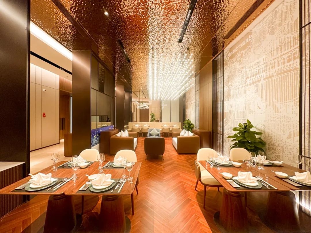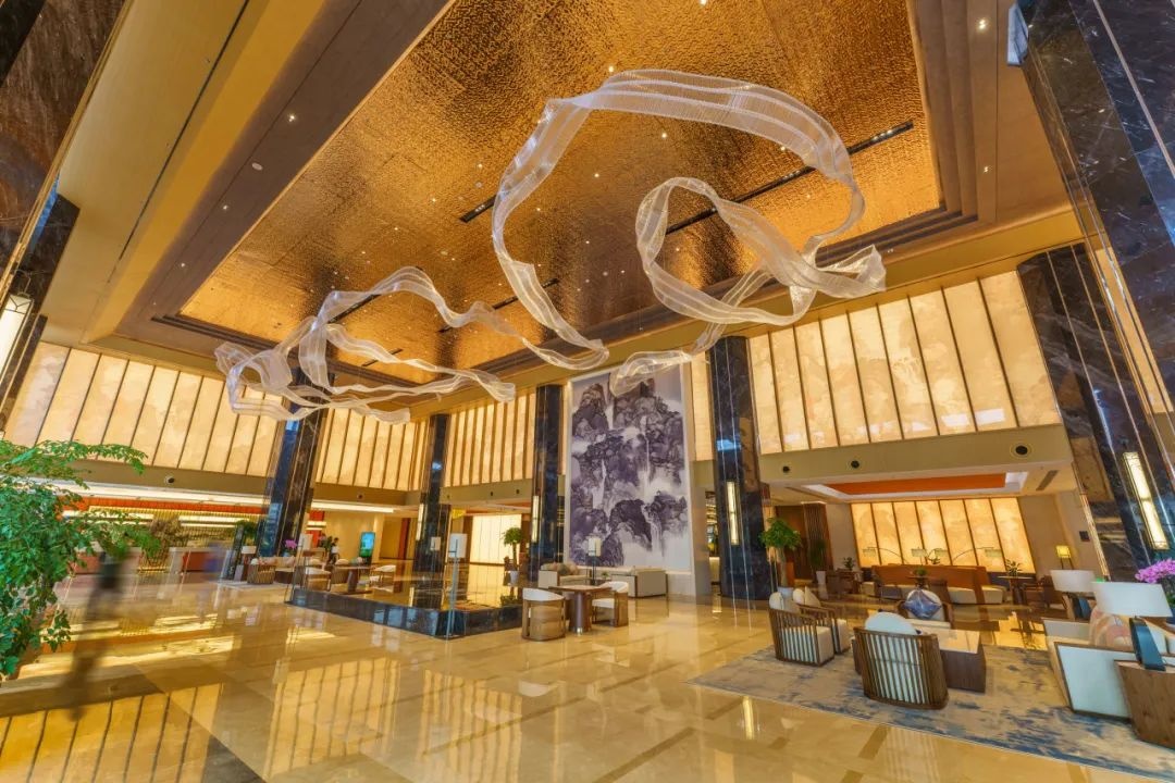 踏入酒店大堂,映入眼簾的是大堂中央一幅恢弘的山水壁畫。從此處開始,到宴會大廳、餐飲包廂、酒廊客房,設計理念均取自聞名天下的《醉翁亭記》,酒店裝飾和布局盡顯“山巒疊嶂、滁菊繁茂、歐梅異香”,將滁州“山水之樂”“宴酣之樂”“休憩之樂”的山水亭城文化詮釋得淋漓盡致。