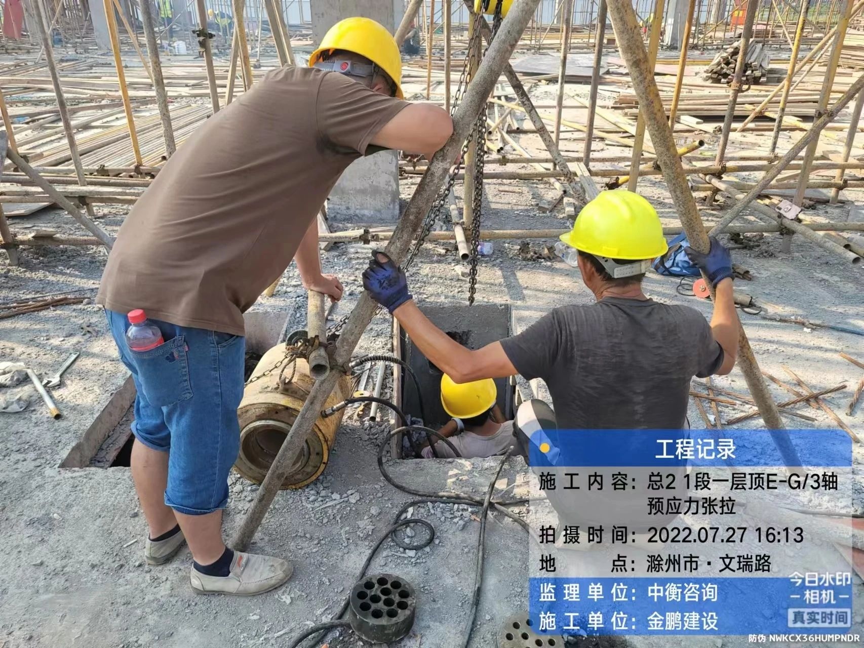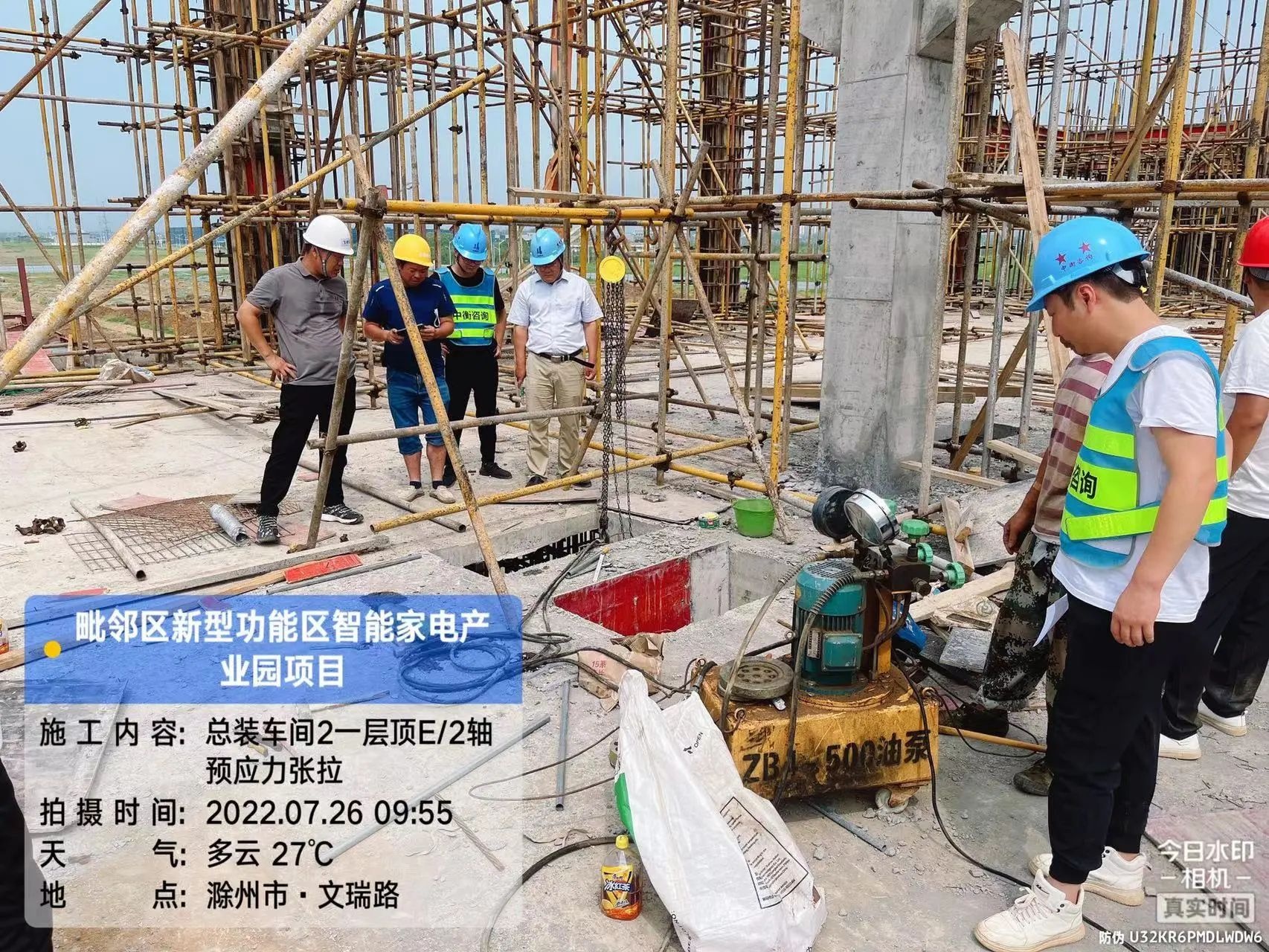 項(xiàng)目總裝車間2,在10.0米標(biāo)高處共有160道大跨度后張法有粘結(jié)預(yù)應(yīng)力梁,施工前做好預(yù)應(yīng)力深化設(shè)計(jì),施工中嚴(yán)格把控鋼絞線、錨具等的材料質(zhì)量,堅(jiān)持張拉設(shè)備及儀表定期維護(hù)、標(biāo)定,張拉過程規(guī)范有序,孔道灌漿一次完成,做到預(yù)應(yīng)力梁施工一次驗(yàn)收合格率100%。