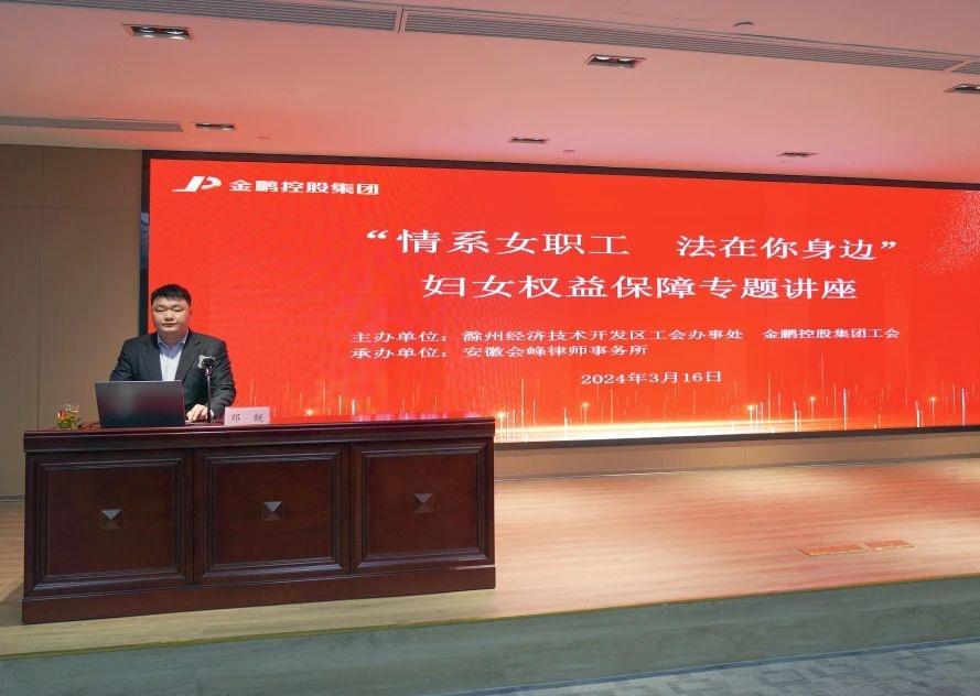 3月16日,集團工會為金鵬女職工送去一份特殊的“節(jié)日禮物”。特別邀請安徽會峰律師事務(wù)所律師到金鵬開展婦女權(quán)益保障專題講座?;顒又校菔袃?yōu)秀青年律師鄧銳圍繞婦女的財產(chǎn)權(quán)益、勞動和社會保障權(quán)益、婦女權(quán)益保障中存在的問題、婦女維權(quán)注意事項等進行了深入闡述,并結(jié)合典型案例,教育引導(dǎo)金鵬女職工在生活中知法、懂法、守法、用法。