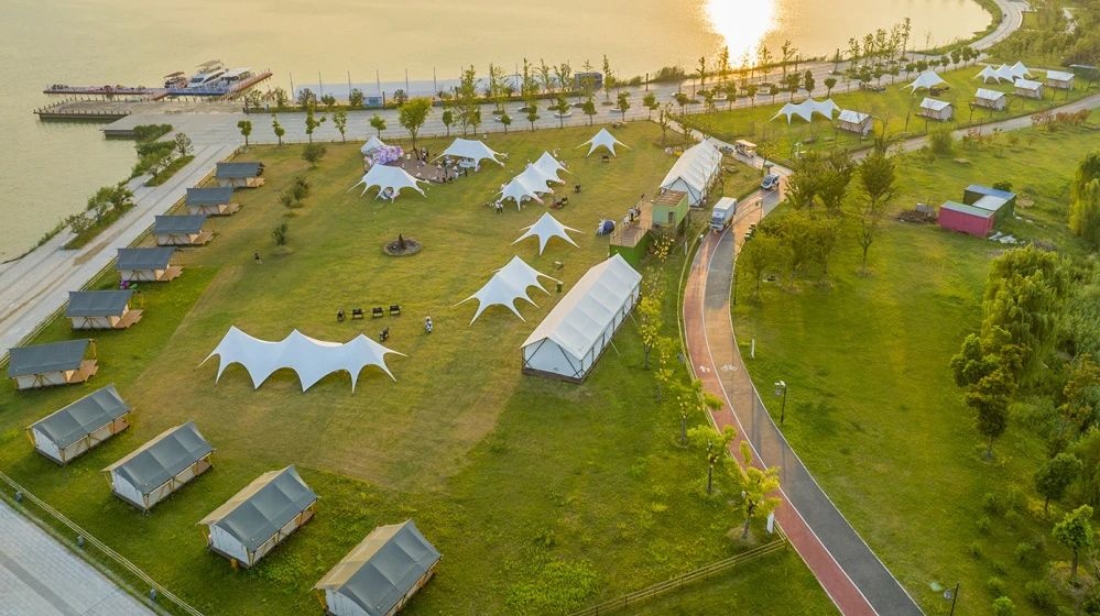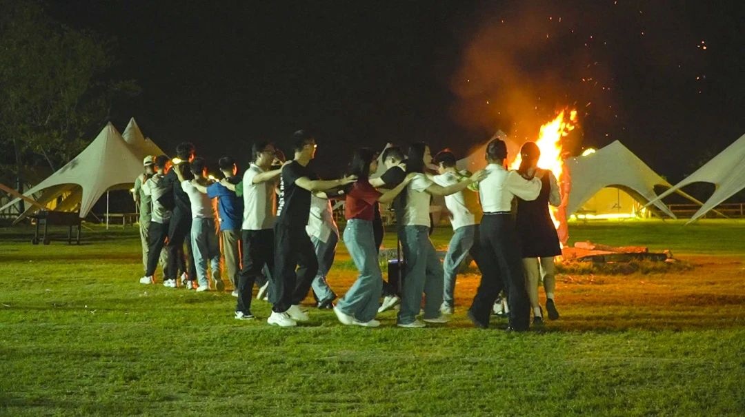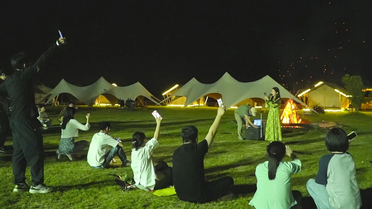 夜幕降臨,漫天繁星下,金鵬皇慶湖的露營基地也熱鬧起來。青年男女坐在露營椅上品嘗美食、輕松交談。伴隨著歌聲、舞蹈,大家在這場篝火派對中,釋放更多的熱情。