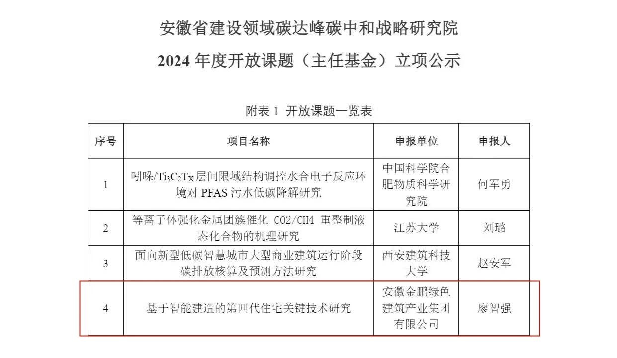 近日,安徽省建設(shè)領(lǐng)域碳達(dá)峰碳中和戰(zhàn)略研究院公布了2024年度開放課題(主任基金)立項(xiàng)名單,其中,金鵬申報(bào)的“基于智能建造的第四代住宅關(guān)鍵技術(shù)研究”獲得了開放課題立項(xiàng)。