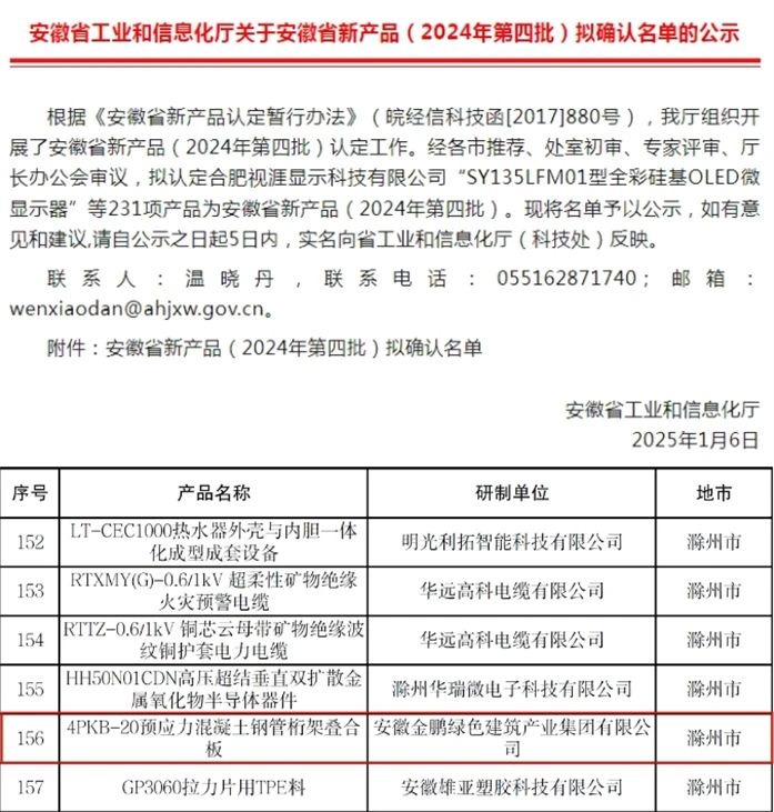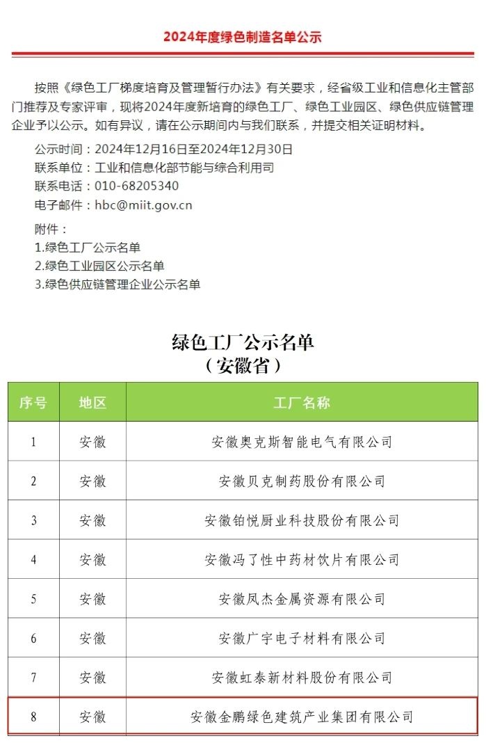 近日,國(guó)家工業(yè)和信息化部公示了2024年度國(guó)家級(jí)綠色制造名單,金鵬綠建集團(tuán)被評(píng)為“國(guó)家綠色工廠”,成為繼金鵬節(jié)能科技獲得認(rèn)定后,金鵬第二家國(guó)家綠色工廠。同時(shí),金鵬綠建旗下“4PKB-20預(yù)應(yīng)力混凝土鋼管桁架疊合板”被認(rèn)定為“安徽省新產(chǎn)品”(2024年第四批),技術(shù)達(dá)國(guó)內(nèi)領(lǐng)先水平。國(guó)家綠色工廠